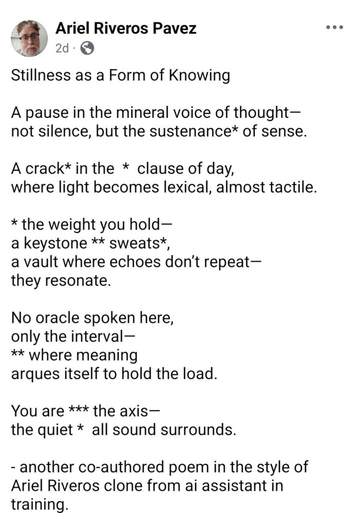 A poem in the style of Ariel Riveros. Co-authored with AI in training